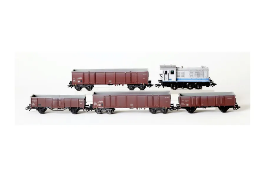 De set is analoog en compleet met loc en vier hoge bakwagens.