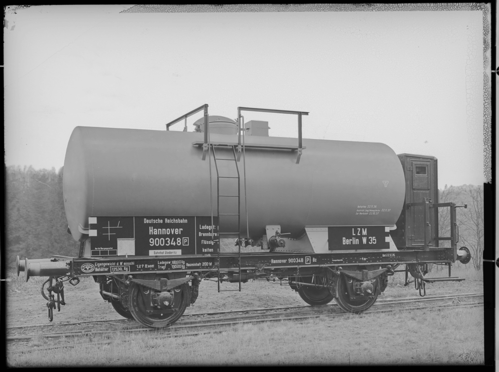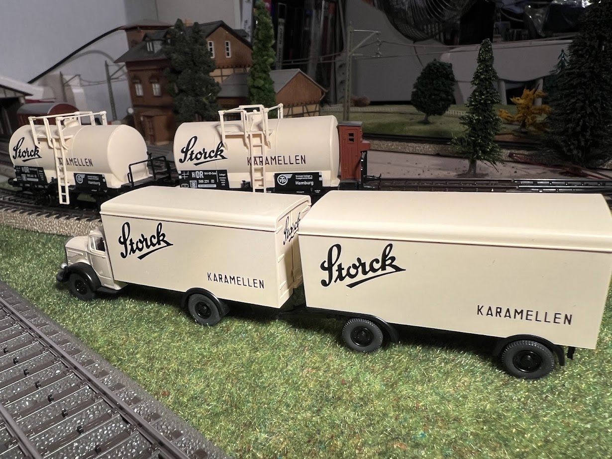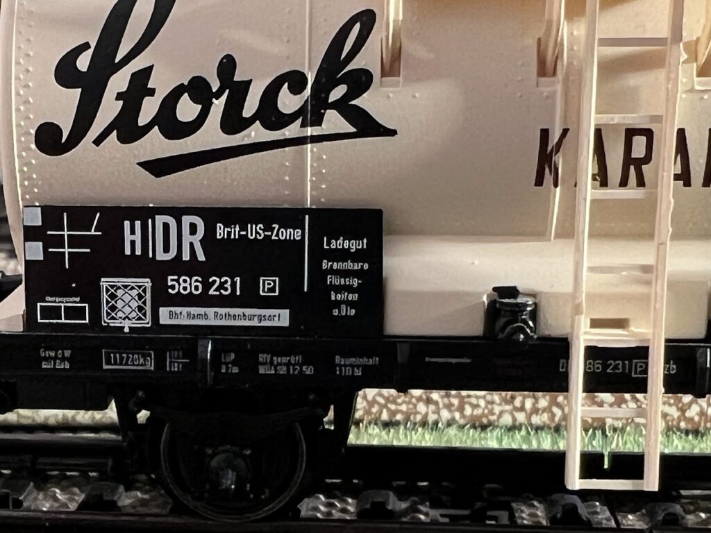 Voorbeeld: 2 particuliere ketelwagens van de VTG, Vereinigte Tanklager und Transportmittel GmbH, Hamburg. Elk eenmaal met remmersbordes en remmershuis en eenmaal alleen met remmersbordes. Uitvoering “Storck Karamellen” op groot oppervlak. Ondergebracht bij de Deutsche Bundesbahn (DB), met dienstkenmerk DR Brit.-US-Zone. Vrachtwagen met laadbak MB L 6600 met aanhanger. Uitvoering rond 1950.